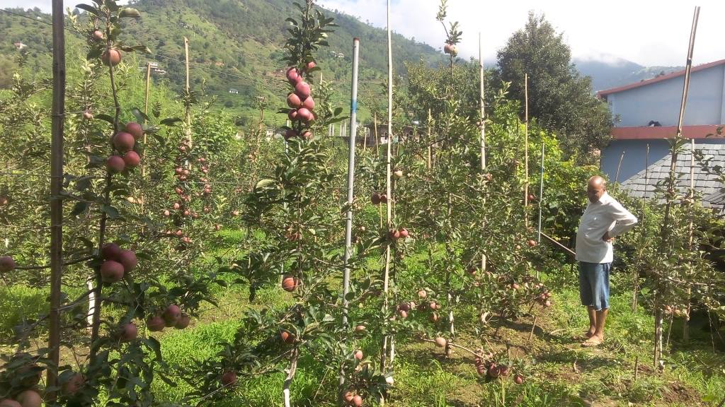 दस गुना तक पैदावार बढ़ाने के उद्देश्य से डा शर्मा ने 2013 में उदयान विभाग हिमाचल प्रदेश से एक वर्ष की आयु के सेब के कुछ पौधे लिये थे | फ़रवरी 2013 में रोपित ये पौधे आज लगभग अढाई वर्ष के हो चुके हैं और कुछ पौधों में पुर्णतया थिनिंग के बावजूद भी इन पौधों ने इस वर्ष अच्छी फ़सल दी है | पौधों में फ़ल का आकार और रंग देखते ही बनता है |
