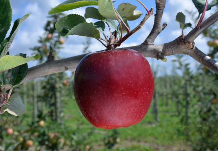 Semi spur variety, Early and homogeneous coloring on the whole tree. About 2-3 weeks earlier than other clones. Flavour is sweet with low acidity. Harvest time: 1 week before Red Del. Standard, not susceptible to alternate bearing.