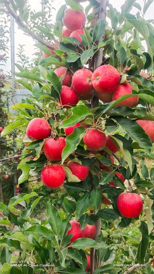 A bright red-purple color apple variety developed from the mutation of Gala in Italy. Fruits start showing color at the walnut stage. Medium to weak growth, Matures around 20-30 July.