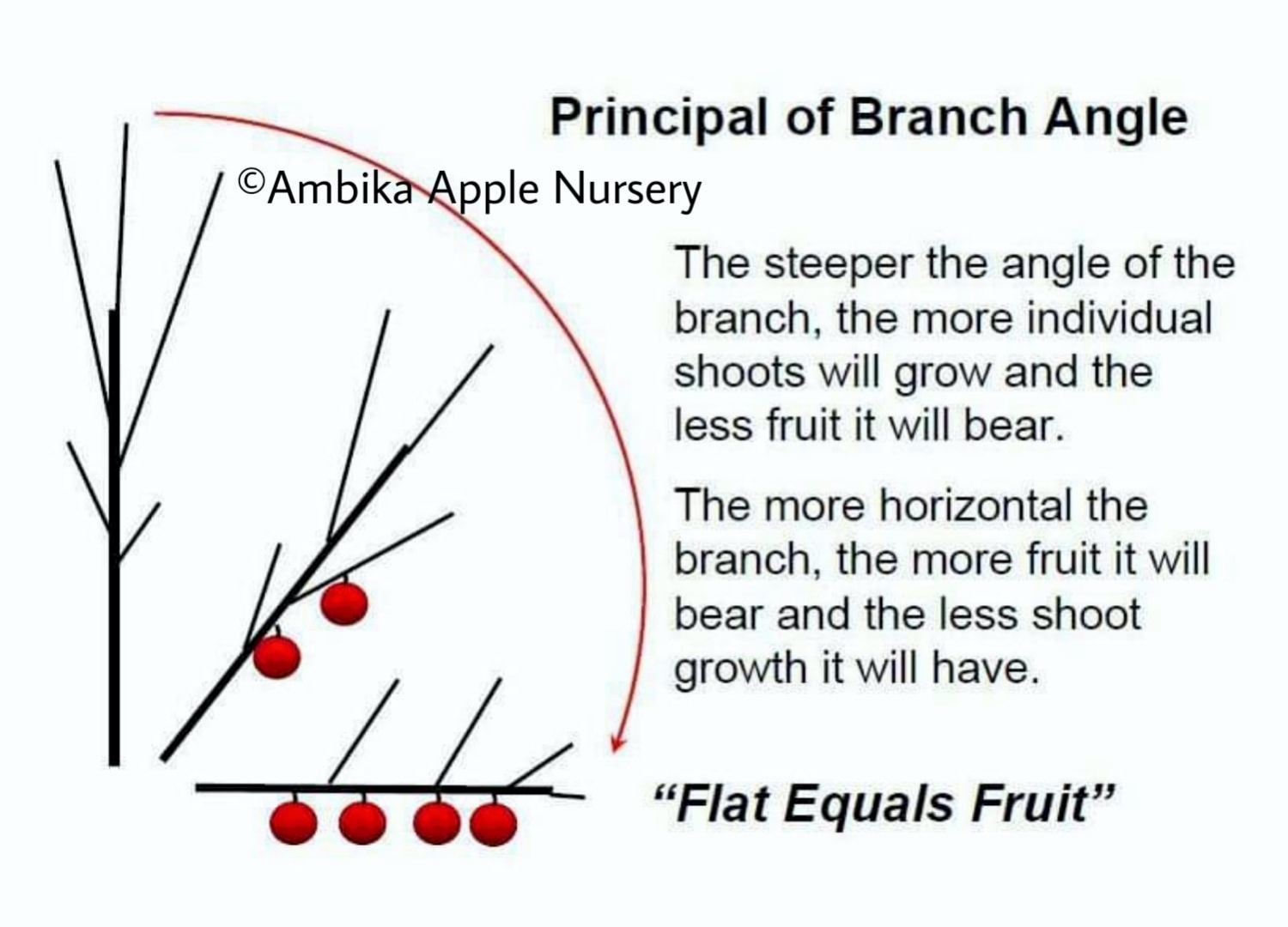 प्राकृतिक रूप से सेब के पेड़ की टहनियां अक्सर सीधी आसमान की ओर बढ़ना शुरू हो जाती हैं। जिस टहनी ने ऊपर की तरफ ग्रोथ ले ली तो यकीन मानिए उसमें बहुत कम बीमे बनते हैं। क्योंकि पत्ते प्रकाश संश्लेषण विधि द्वारा जो कार्बोहाइड्रेट तैयार करते हैं, वह सीधा जड़ों में चले जाते हैं और टहनी में नाइट्रोजन की मात्रा अधिक होने के कारण उसका रुझान बजाय बीमे बनने के, ग्रोथ की तरफ अधिक रहता है। इसके विपरीत यदि टहनी को तने के साथ 90 डिग्री पर झुकाया जाए, तो टहनी में कार्बोहाइड्रेट की मात्रा संचित हो जाती है जो बीमे बनने के काम आती है और अधिक फल लगते हैं। सलंग्न चित्र में यह स्पष्ट रूप से दर्शाया गया है।